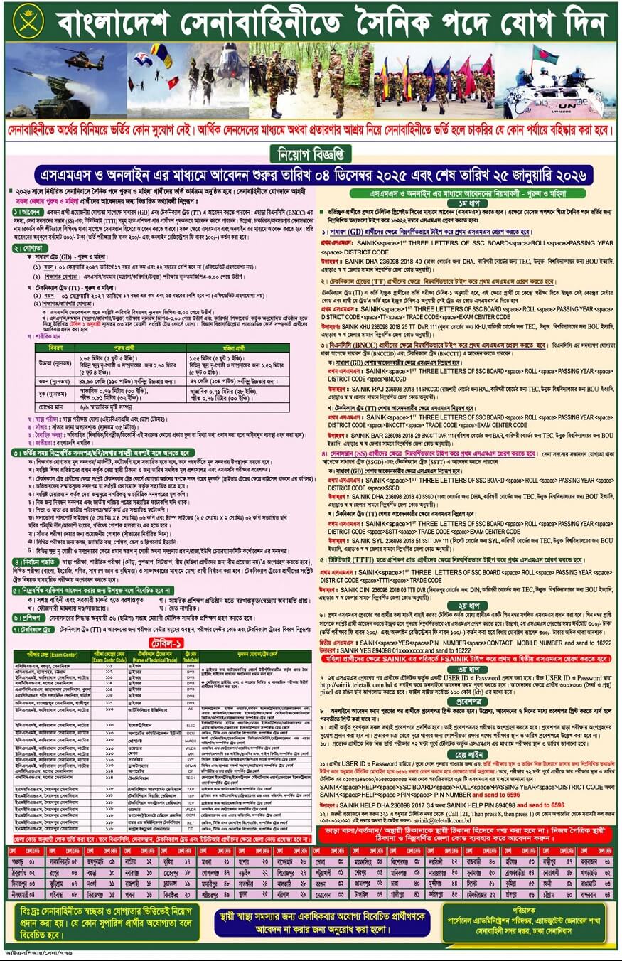 বাংলাদেশ সেনাবাহিনী সৈনিক পদে নিয়োগ বিজ্ঞপ্তি